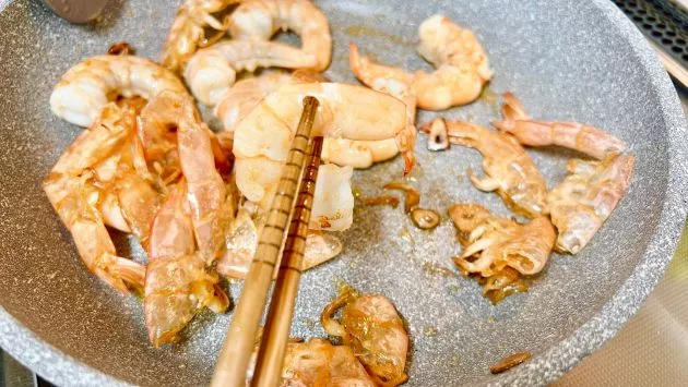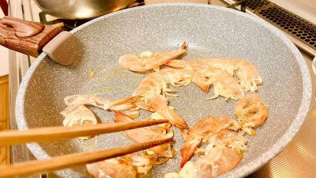 しばらく炒めて良い香りがして来たら、海老の身を加えてさらに炒めます。色が変わってきたら酒を加えて蒸し焼きにして火を通します。