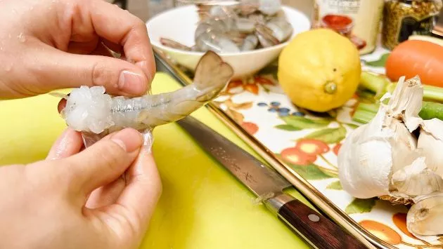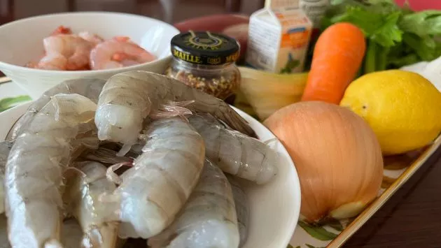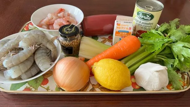 お次はビスクスープ!生のまま背ワタと殻を取り除き、身と殻を別にしておきます。