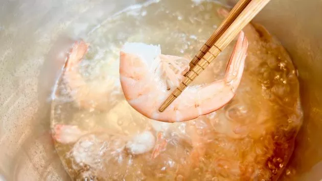 殻の上から背ワタを取り出し、コンソメと塩入のお湯で茹でます。