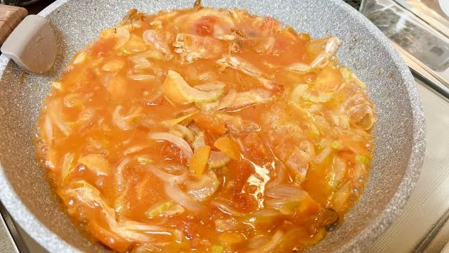しんなりしてきたら、トマト缶と水、塩コショウを加えて煮込んでいきます。