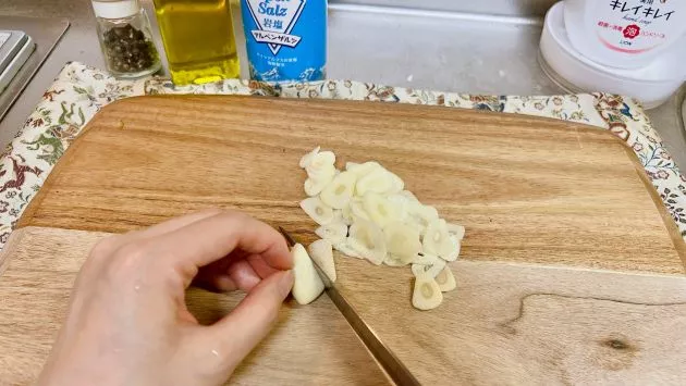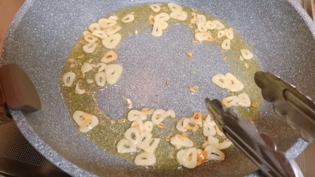 フライパンにオリーブオイルを熱し、スライスしたにんにくを炒めて香りを移します。