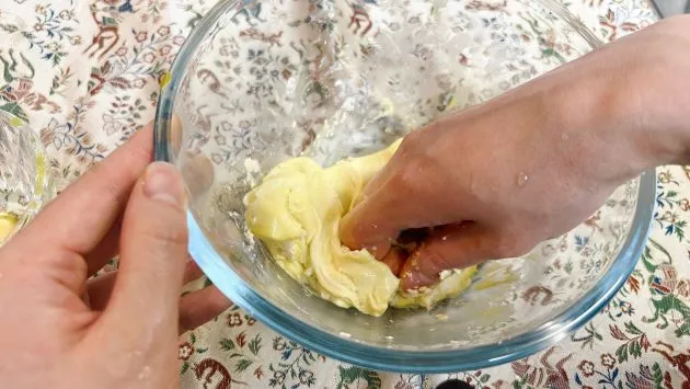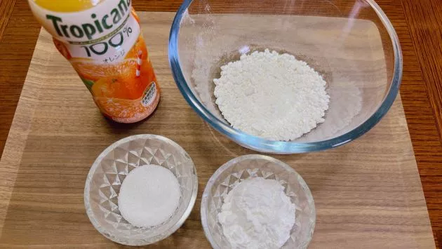 白玉粉にオレンジジュースを加えて混ぜます。耳たぶくらいの柔らかさになるようにジュースを加えて、フードカラーで色味を調節しながらまとめます。