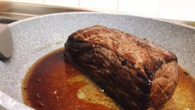 全部の面に焼き目がついたら料理酒と醤油を加えて蓋をし弱火で蒸し焼きにします。
