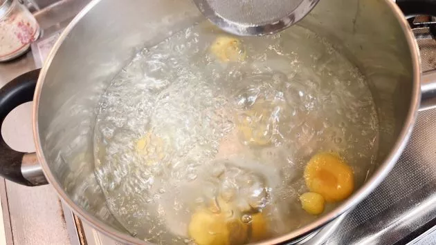 たっぷりのお湯で茹でて冷水に取り出しておきます。