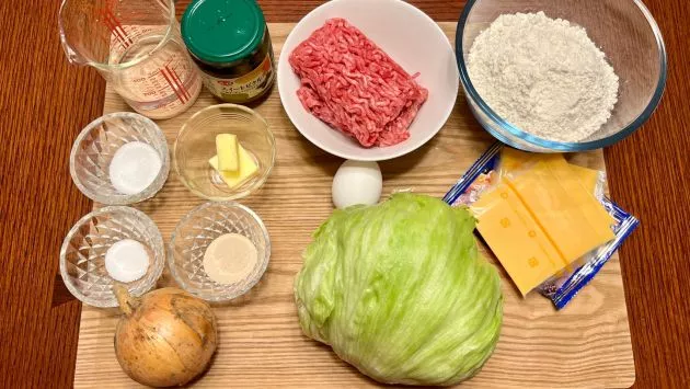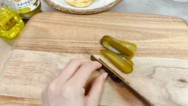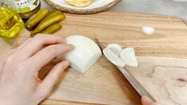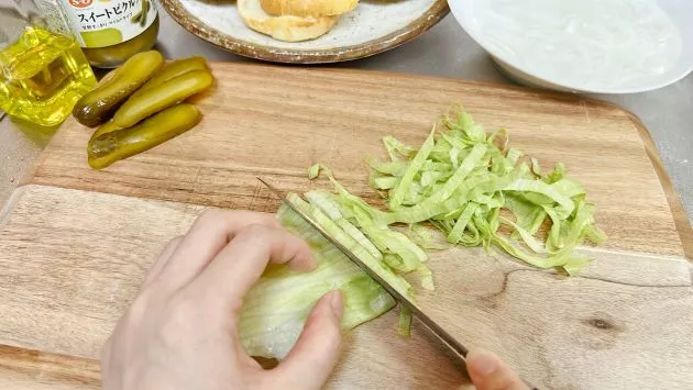 ピクルス、玉ねぎ、レタスは薄く切っておきます。