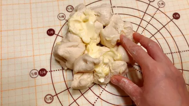 生地が手にくっつきづらくなってきたら、バターを加えてさらにコネコネ、、、。