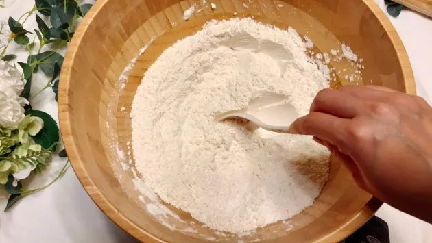 まずはボウルに強力粉と薄力粉、ドライイーストと砂糖を混ぜ合わせます。