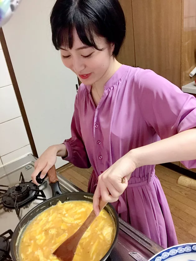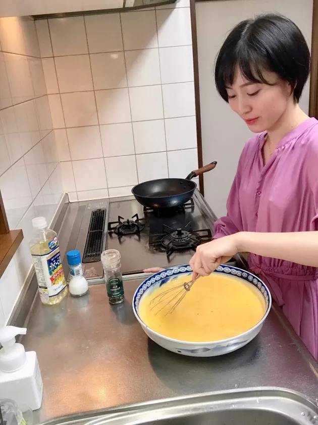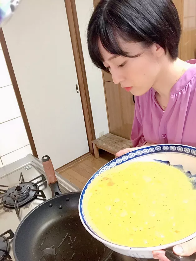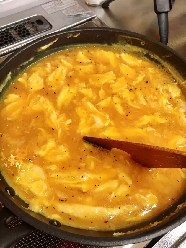 フライパンに流し込んだら底が焦げないように混ぜながら半熟になるまで中火で加熱します。スクランブルエッグ状になったら、弱火にしてフライパンに蓋をして周りを固めていきます。