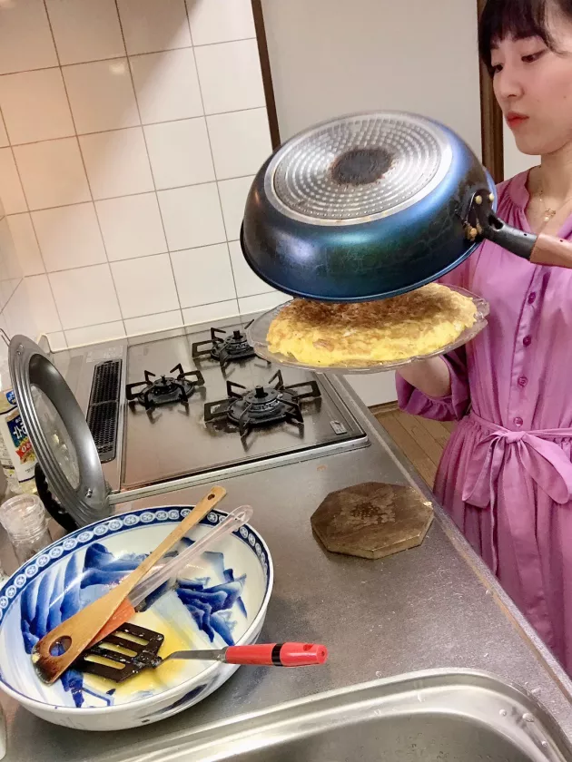 形になってきたらお皿を使ってひっくり返し、裏面も焼きます。フライパンがかなり重くて片手で持つのが大変でした!