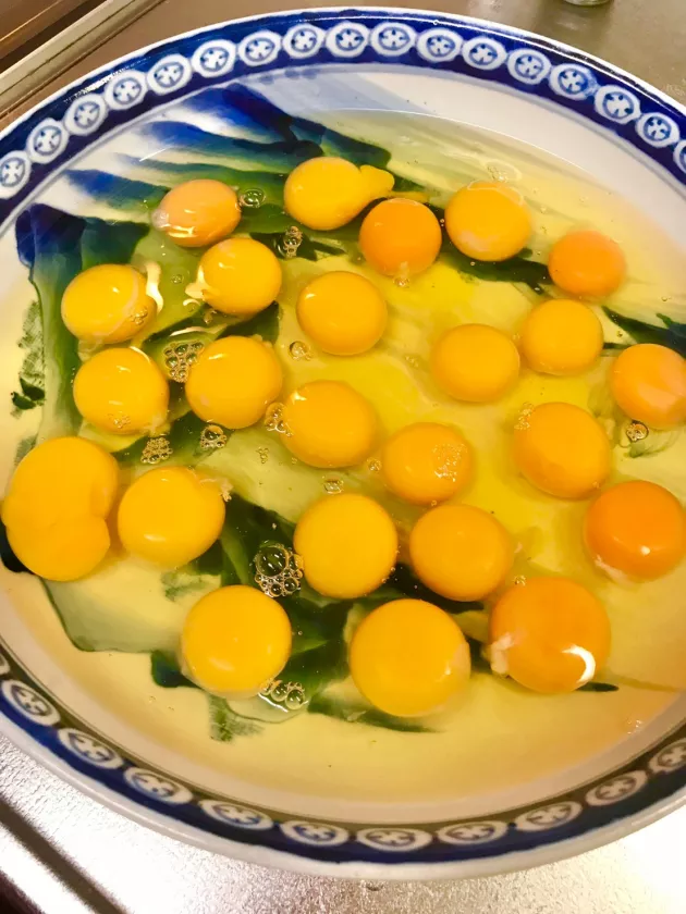 まずは卵をたくさん用意!24個ってすごい量です。そして大量の卵を入れられる器も用意します。(大きなものを探して来たら和風な器になりました。笑)