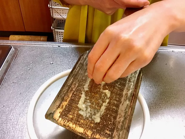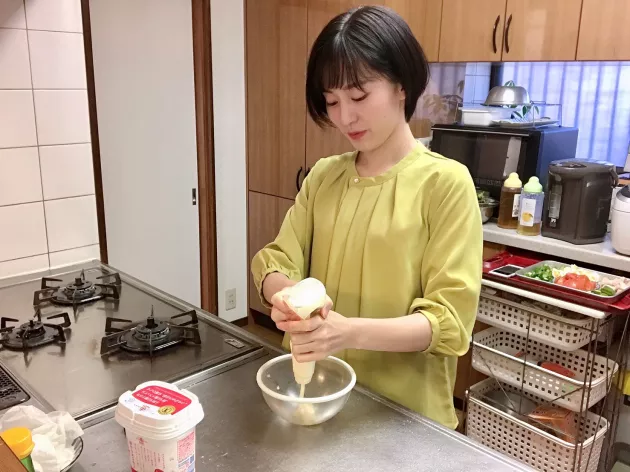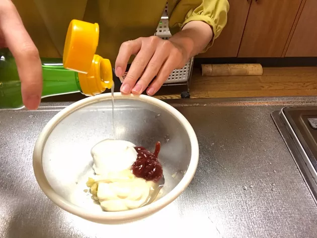そしてドレッシングづくりです。 すりおろしたニンニクと、マヨネーズ、ケチャップ、ヨーグルト、レモン果汁、砂糖、塩コショウをよく混ぜ合わせればOKです!