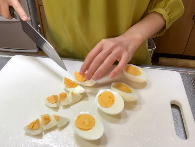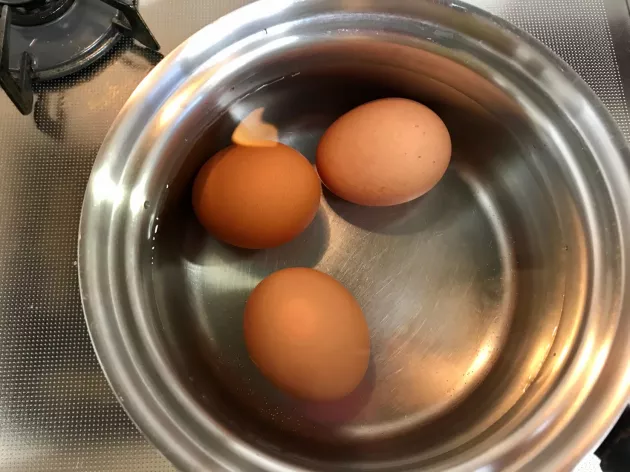 まずはゆで卵を茹でておきます。黄身までしっかり固めに茹でます。 茹でてる間にほかの具材を準備します。