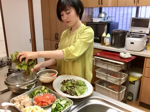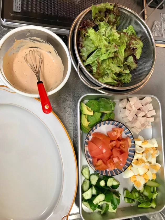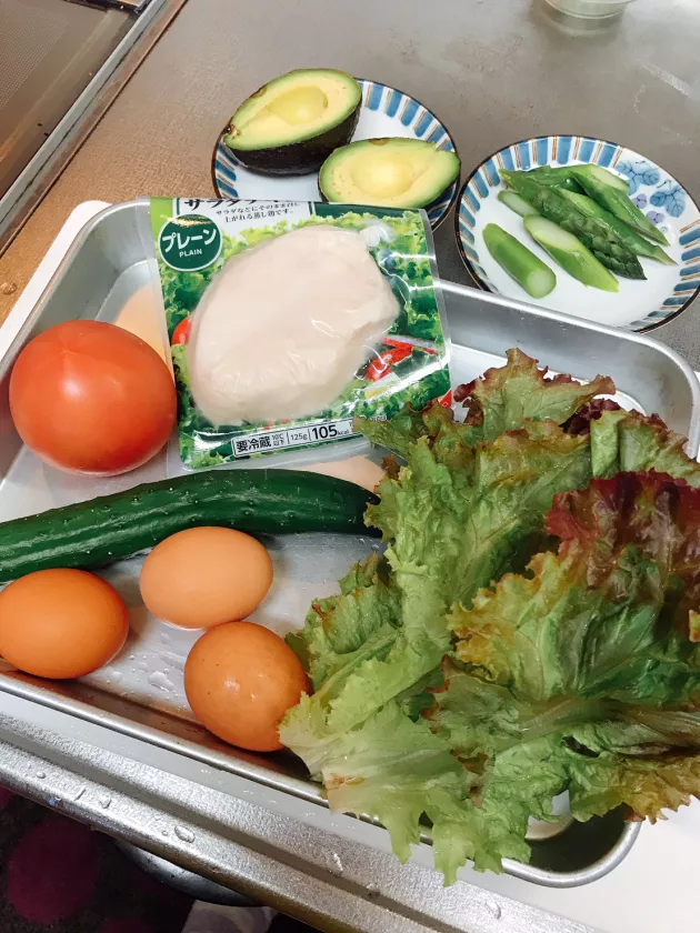 サニーレタスを洗ってちぎります。 きゅうり、アスパラ、トマトアボカドを食べやすい大きさに切り、サラダチキンも切っておきます。具材がゴロゴロ乗ってるコブサラダらしく切っていきます。卵も殻をむいて切ります!