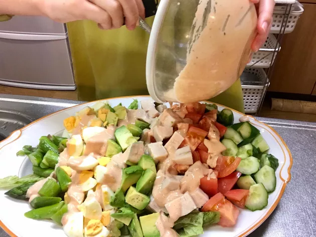 最後にドレッシングをかけて完成です!カラフルで豪華な見た目に仕上がりました!