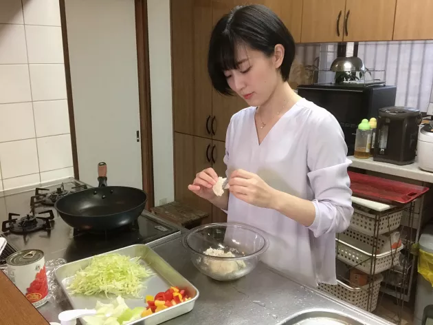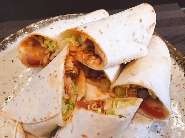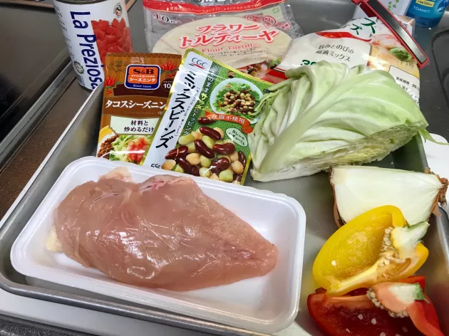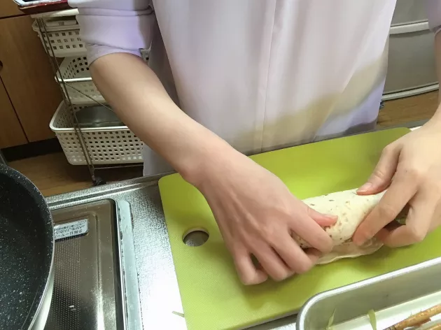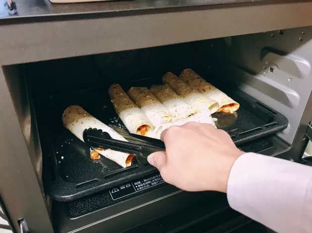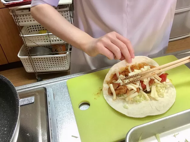 ここからは時間の勝負!トルティーヤが冷めて硬くなる前に、キャベツ、チキンタコス、ピザ用チーズを素早く包みます。
