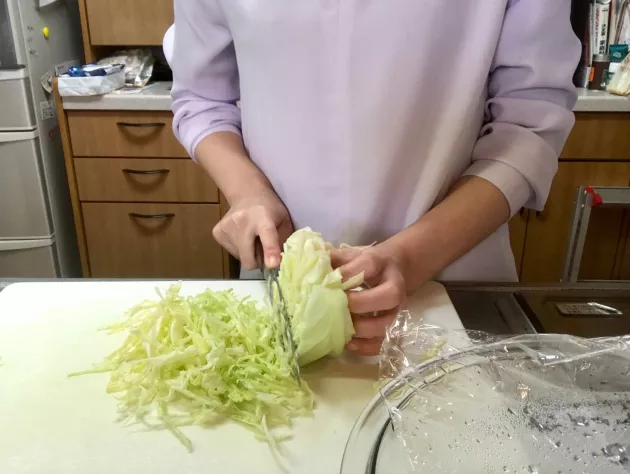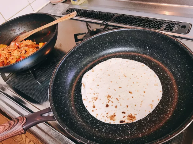 キャベツを千切りにして、トルティーヤをフライパンで軽く温めます。
