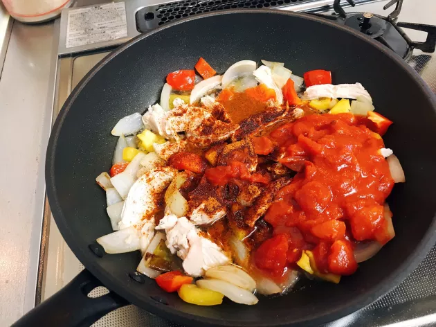 玉ねぎが透き通ってきたら、鶏肉、トマト缶、水、タコスの素、ミックスビーンズ、塩コショウを入れて煮込んでいきます。タコスの素を入れると一気にメキシカンな香りに!食欲のわくいい香りです!!
