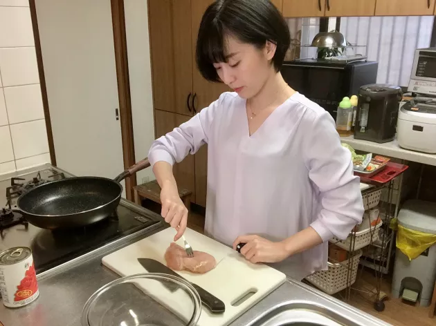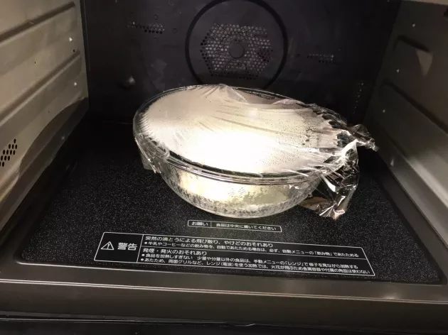 まずは皮を取り除いた鶏むね肉にフォークで穴をあけ、料理酒とともにレンジでチンします。 お肉がほぐれるくらいに火が通ったら軽くほぐしておきます。