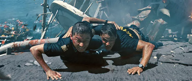 そして忘れてはいけない退役軍人のおじいちゃん達です。残った一隻の駆逐艦で戦っていたアレックス達ですが、ついに最後の一隻も破壊されてしまいます。そこで、70年も前に作られ、今では記念艦となっていた戦艦「ミズーリ」に乗って敵と戦うことになります。しかし、古すぎて誰も動かし方が分からない!そんな時かっこよく現れたのが、かつての海兵おじいちゃん達です。壮大な音楽とともにスローモーションで続々と集結するナイスタイミングなおじいちゃん達の演出は、かっこつけすぎでちょっと笑ってしまいました。(笑  が、かつてのレジェンドたちと共に戦う展開は盛り上がりますよね!