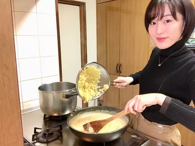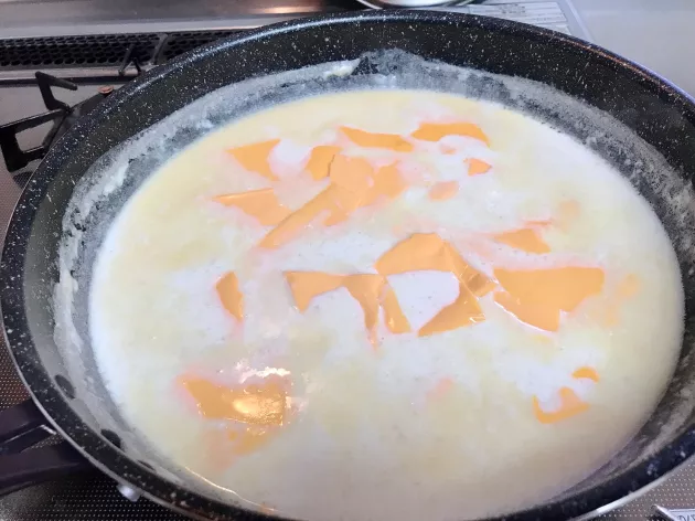ベースとなるホワイトソースが出来上がったら、チェダーチーズをこれでもかっていうくらい投入します!ほんとにすごい量です!