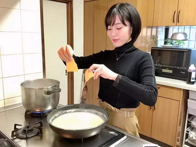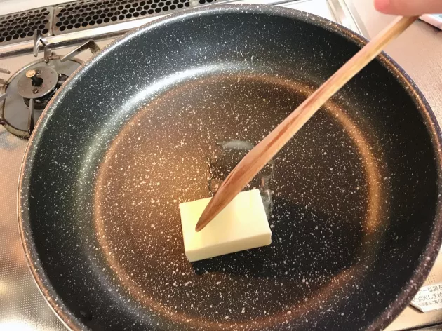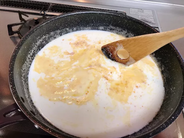 まずはソースづくり。たっぷりのバターを溶かし、強力粉を加えて混ぜます。そこに牛乳を加えてとろみがつくまで火を入れます。塩コショウとコンソメも入れておきます。