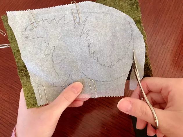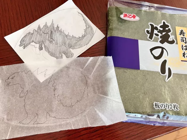 ジュースを注ぐ前に、キャラ弁づくりです。ゴジラのシルエットをクッキングシートに移し、海苔と重ねて切っていきます。破れないようにそーっと。小さくて刃の薄いはさみが良いと聞いたので、メイク用のはさみを消毒して使っています。確かに細かいところまで切りやすくて良いです!