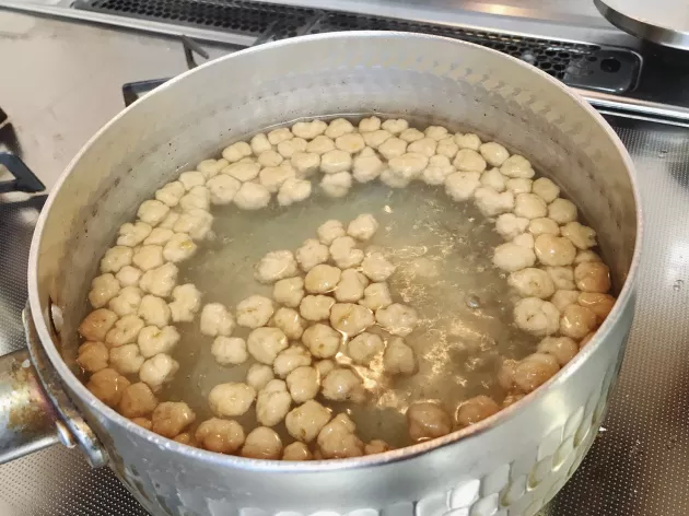 生地が固くてなかなか綺麗な丸になりませんっ難しいっ、カップヌードルの謎肉に見えてきました(笑)