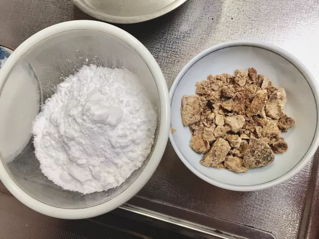 まずは卵ドリンクから。私の眼にはタピオカに見えたのでタピオカで作っていこうと思います。片栗粉と水、黒糖を鍋に入れて加熱しながら混ぜます。ひとまとまりになったら取り出して、やけどしないように注意しながらコネコネ、、、。