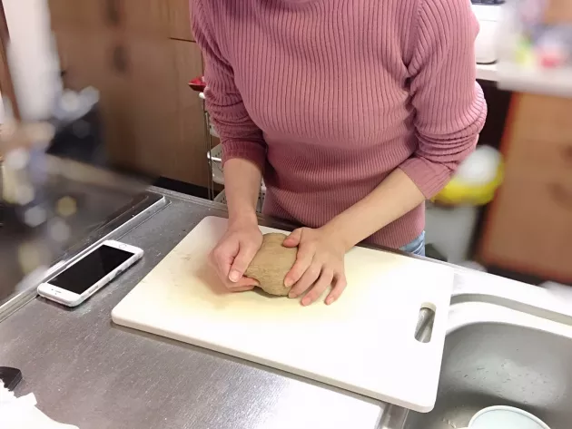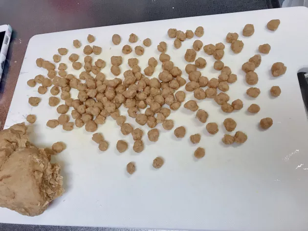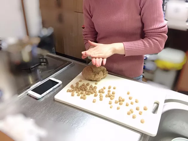 片栗粉の塊がなくなり、色も均等になるまで捏ねたら、一粒一粒丸めていきます。