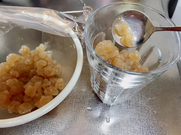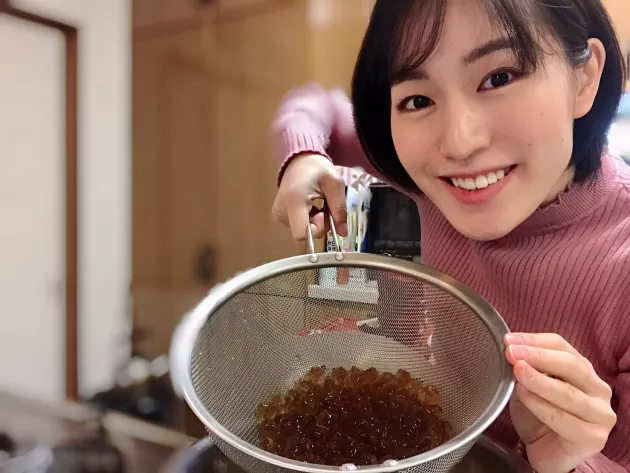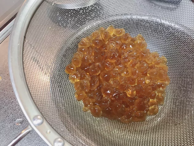 意外とちゃんとタピオカっぽくなりました!何粒か味見してみると、モチモチしていてびっくり!食感は完全にタピオカです!味は、お店で頼むものより片栗粉の香りが強いですが、黒糖のほんのりとした甘さがあって美味しいです。