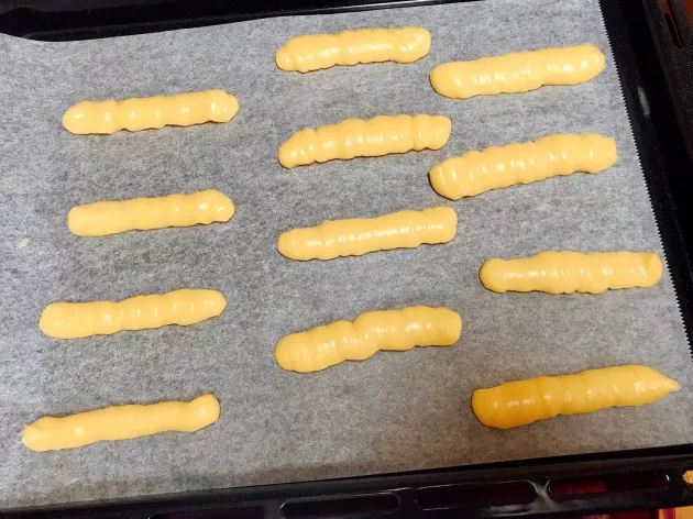 卵を足していきトロッとしたらOK!絞り袋に入れて鉄板の上に絞り出していきます。なんだか黄色いミミズのような見た目になり、こんなのがエクレアになるの!?という気持ちです。