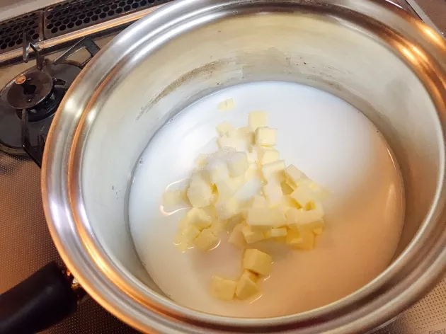 まずは鍋に牛乳、無塩バター、水、砂糖、塩をいれ沸騰させます。