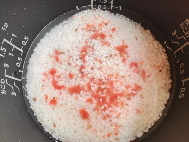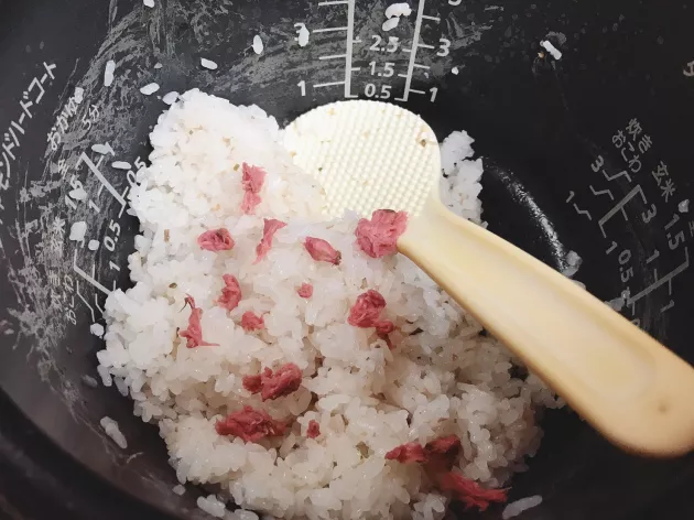 洗ったお米に、桜の茎、塩漬けを戻すのに使ったお水、たたいた梅干しを加えて炊飯スタート!