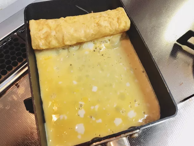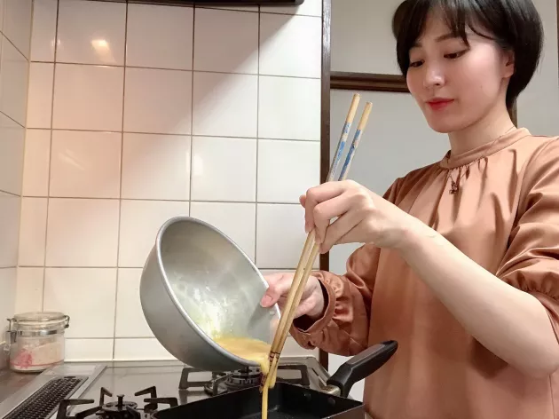 卵焼きを焼いて(なんとなく明里の卵焼きは甘そうなので甘めの味付けで!)