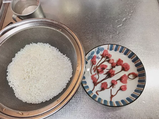 桜の塩漬けを使って炊き込みご飯にしていきます。