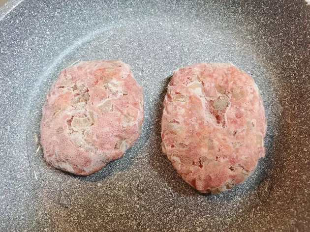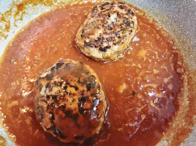 作り置きの冷凍ハンバーグを焼き、ブロッコリーを茹でます。