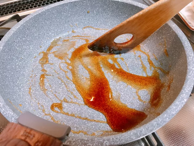 醤油、砂糖、片栗粉、水を混ぜ合わせたものを火にかけ、とろみがついたらお団子にかけて完成です!