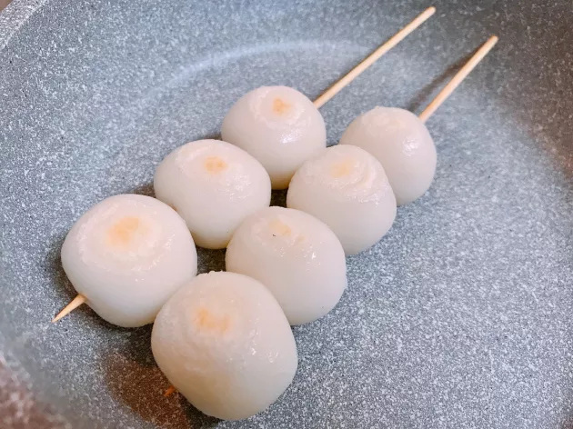 みたらし団子は串に刺した後フライパンで少し焼き色を付けます。