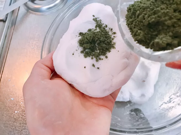 もうひとつにはよもぎ粉を混ぜ緑にしていきます。
