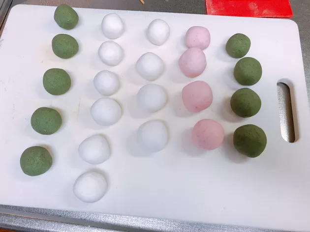 三色の生地が出来たらお団子サイズに丸めていきます。意外と綺麗な球状にするのって難しいです。