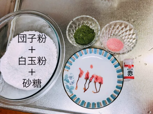 三色団子のピンク団子用に、桜の塩漬けと桜パウダー、食紅を準備。