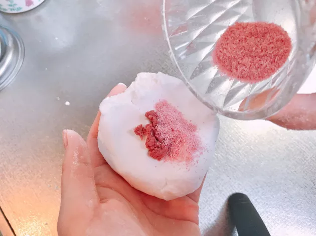 生地を三つに分け、一つには塩抜きして刻んだ桜の花とパウダーを混ぜます。それだけだと色があまり変わらないので食紅を追加。