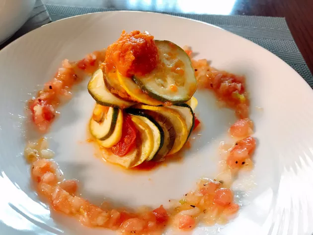 ラタトゥイユはフランスの家庭料理で、普通のラタトゥイユは特に洒落た食べ物ではありません。しかし、レミーの作るラタトゥイユは野菜を薄くスライスして綺麗に並べているので、高級レストランで出てきてもおかしくない美しい見た目です。今日はそんなお洒落なラタトゥイユを目指します!
