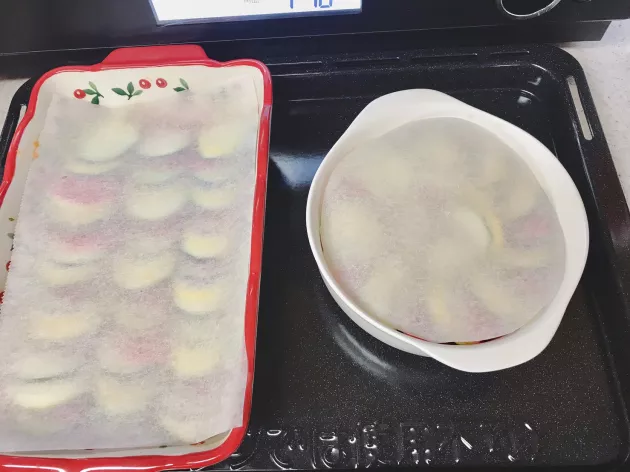 綺麗に並べたらオリーブオイルを回し掛け、クッキングシートを乗せてオーブンで焼きます。