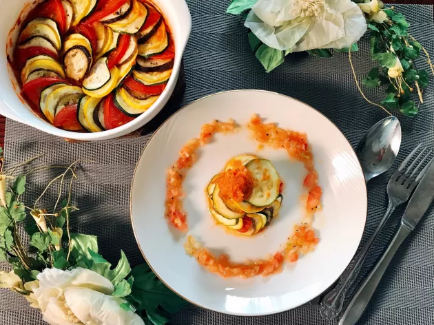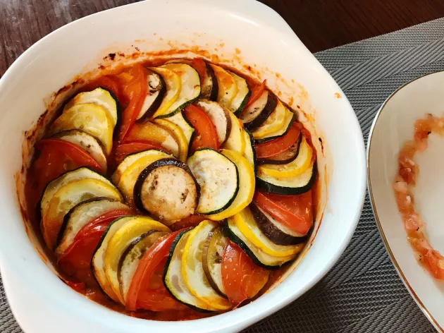 ラタトゥイユが焼けたら、お皿に盛り付けて完成です!