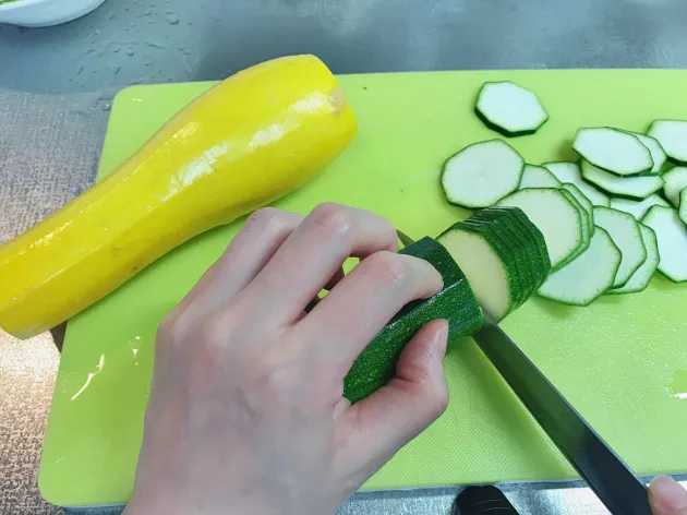 次に野菜をスライスしていきます。映画ではスライサーを使っていましたが、うまくいかなかったので包丁で。均等に薄ーくスライスしていきます。