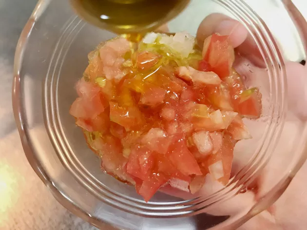みじん切りにした玉ねぎとトマトに、オリーブオイルとホワイトビネガー、塩コショウを加えて混ぜるだけ!とっても簡単な爽やかソースです。