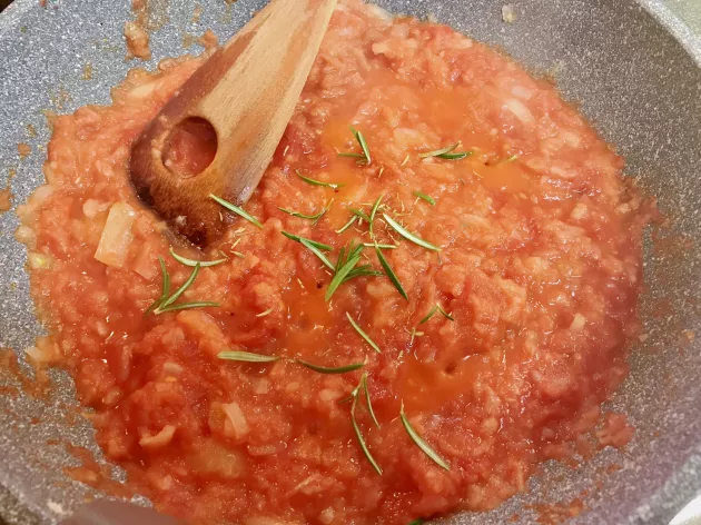 まずはニンニク、玉ねぎ、トマトの缶詰、ローリエ、タイム、ローズマリーを煮込みソースを作ります。ミキサーでピューレにしておきます。