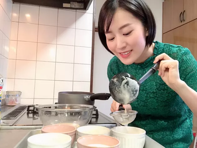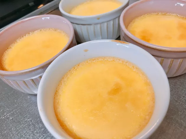 バニラエッセンスを加えたら、ココットに注ぎ入れ、お湯を張ったバットに並べ、そのままオーブンでじっくりと蒸しながら焼いていきます。