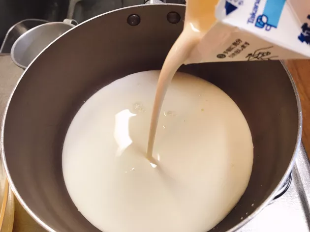 お鍋に牛乳と生クリームを合わせ、温めます。